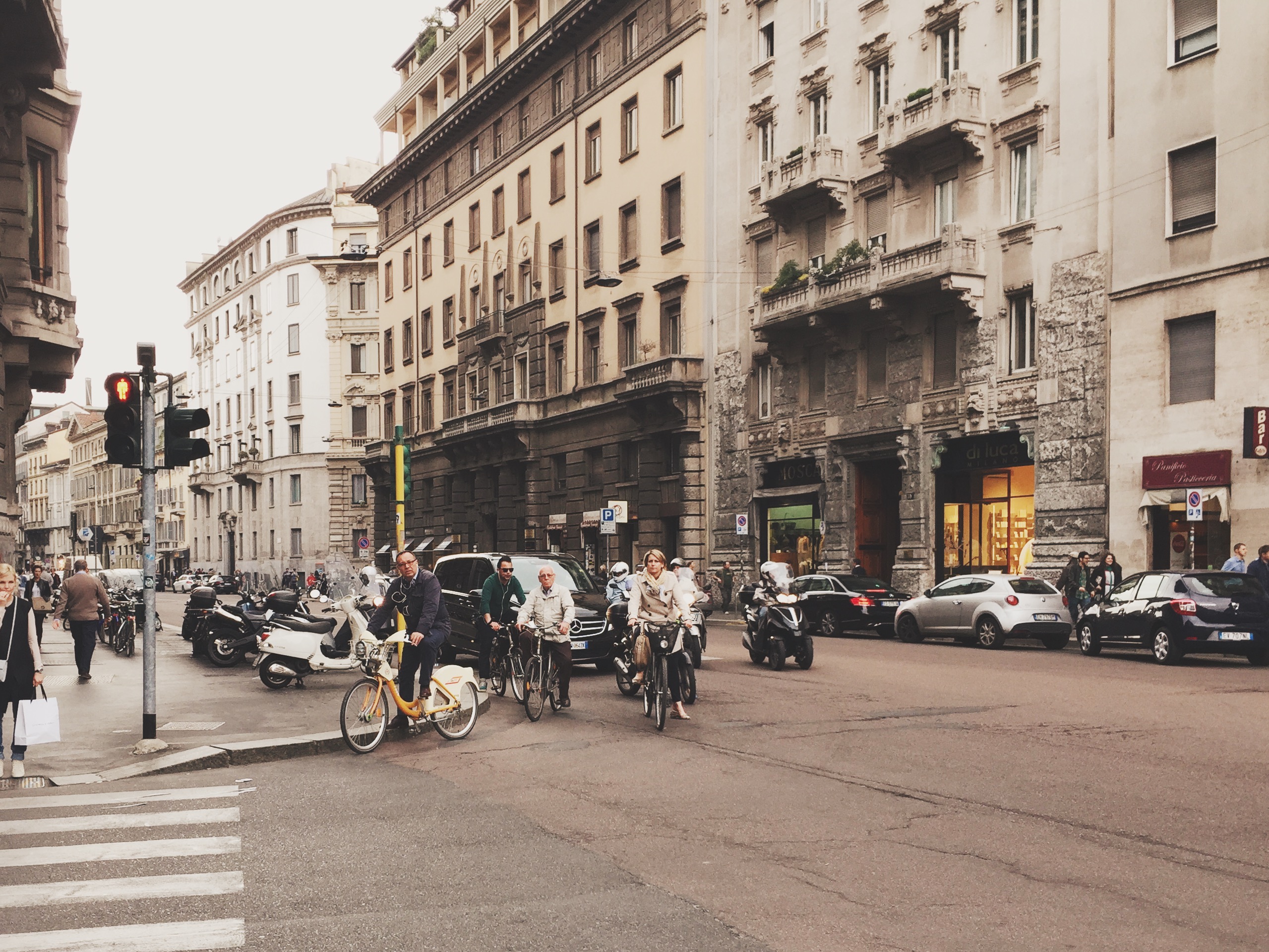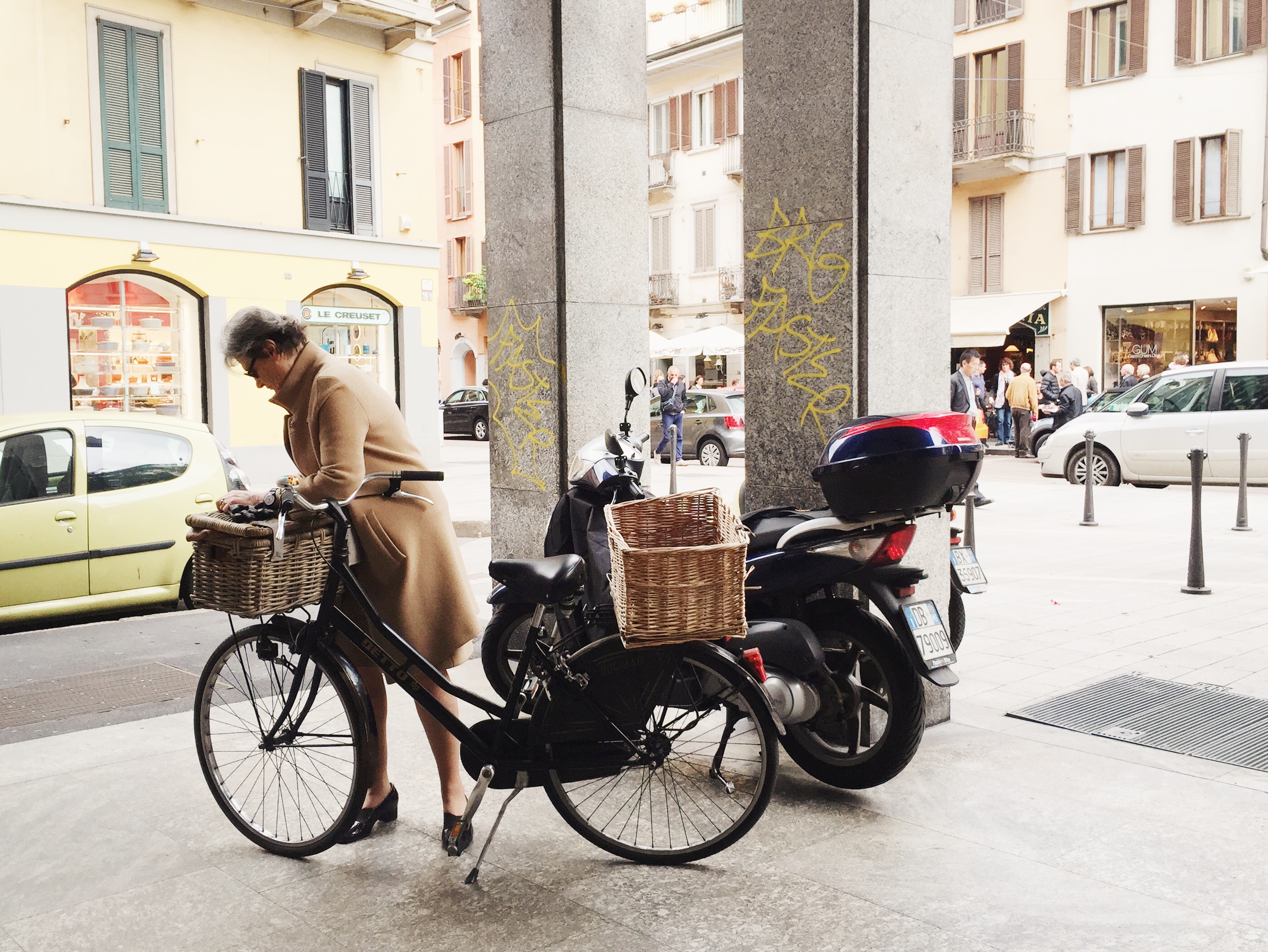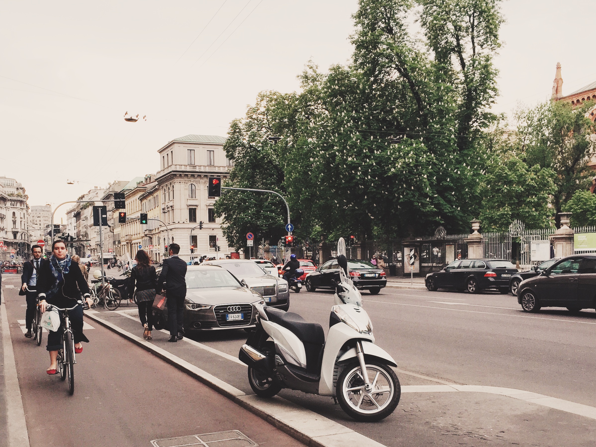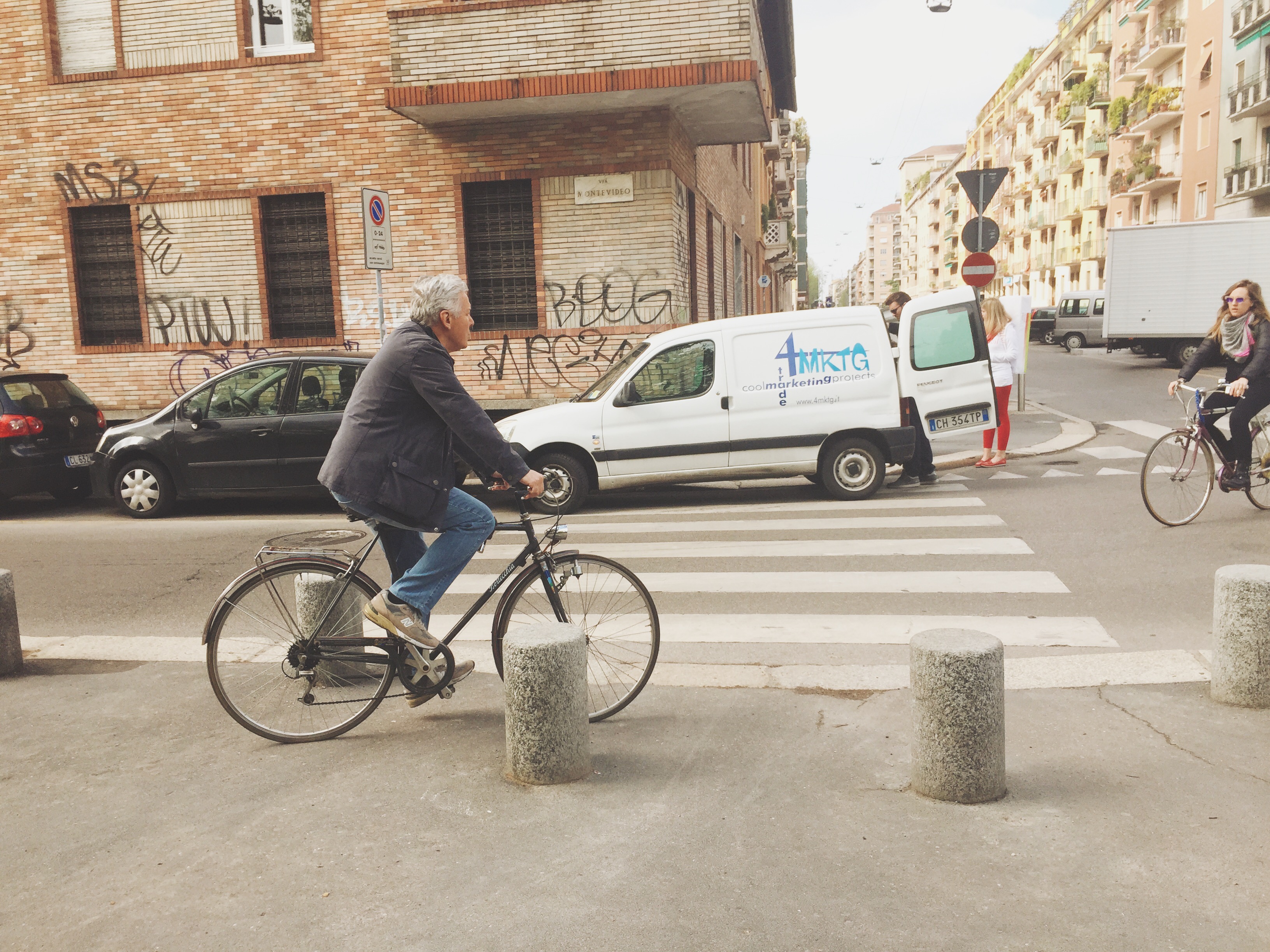 При существующих в Милане ограничениях скорости, местные велосипедисты могли бы вполне успешно соперничать с машинами, но вместо этого они в полной мере проявляют специфику национального характера. Итальянцы шумные, бойкие, но неспешные. Это дико бесит, когда ты стоишь в очереди на кассу, но радует, когда мимо тебя степенно едут на велосипеде симпатичные, хорошо одетые люди.