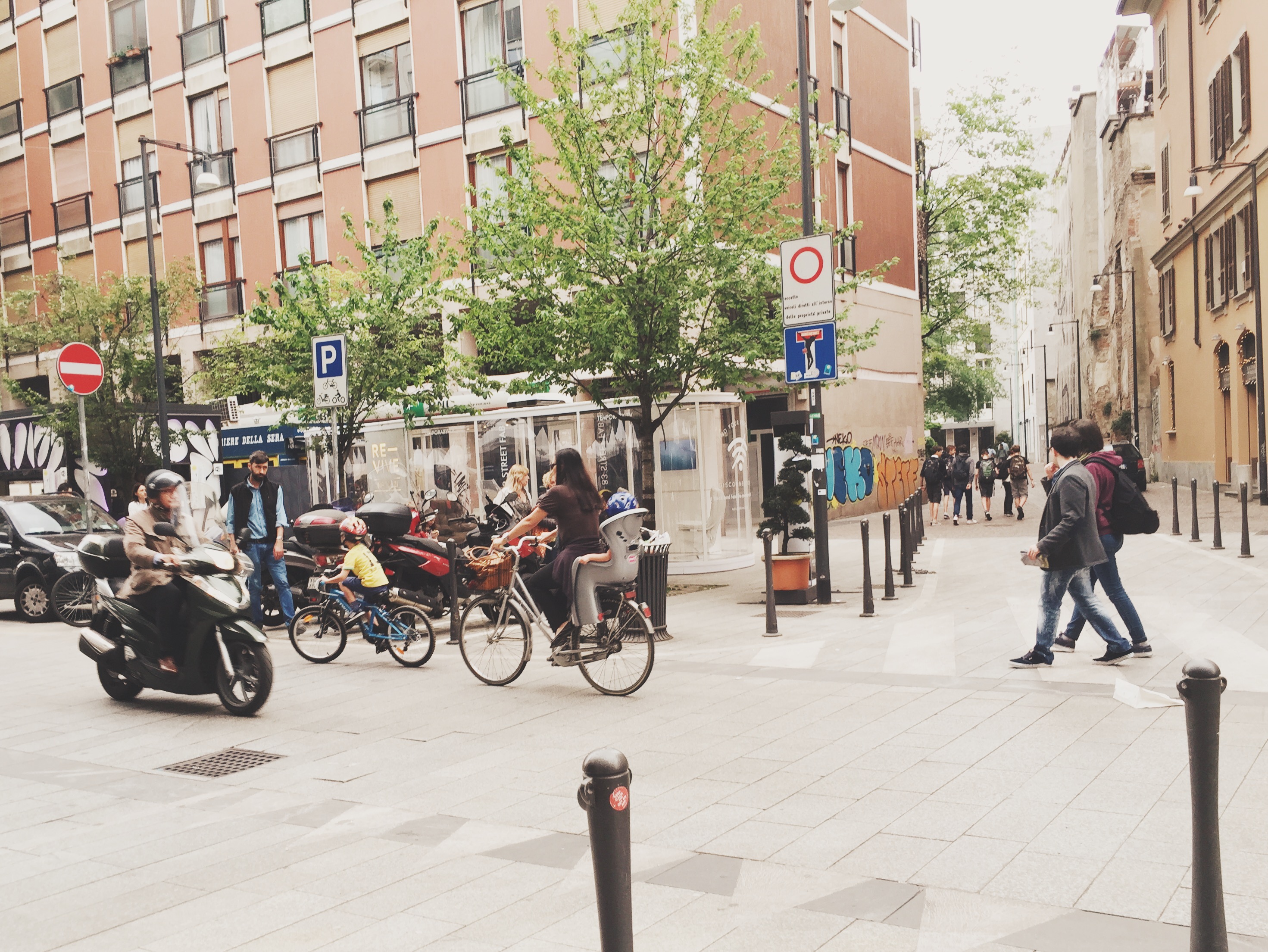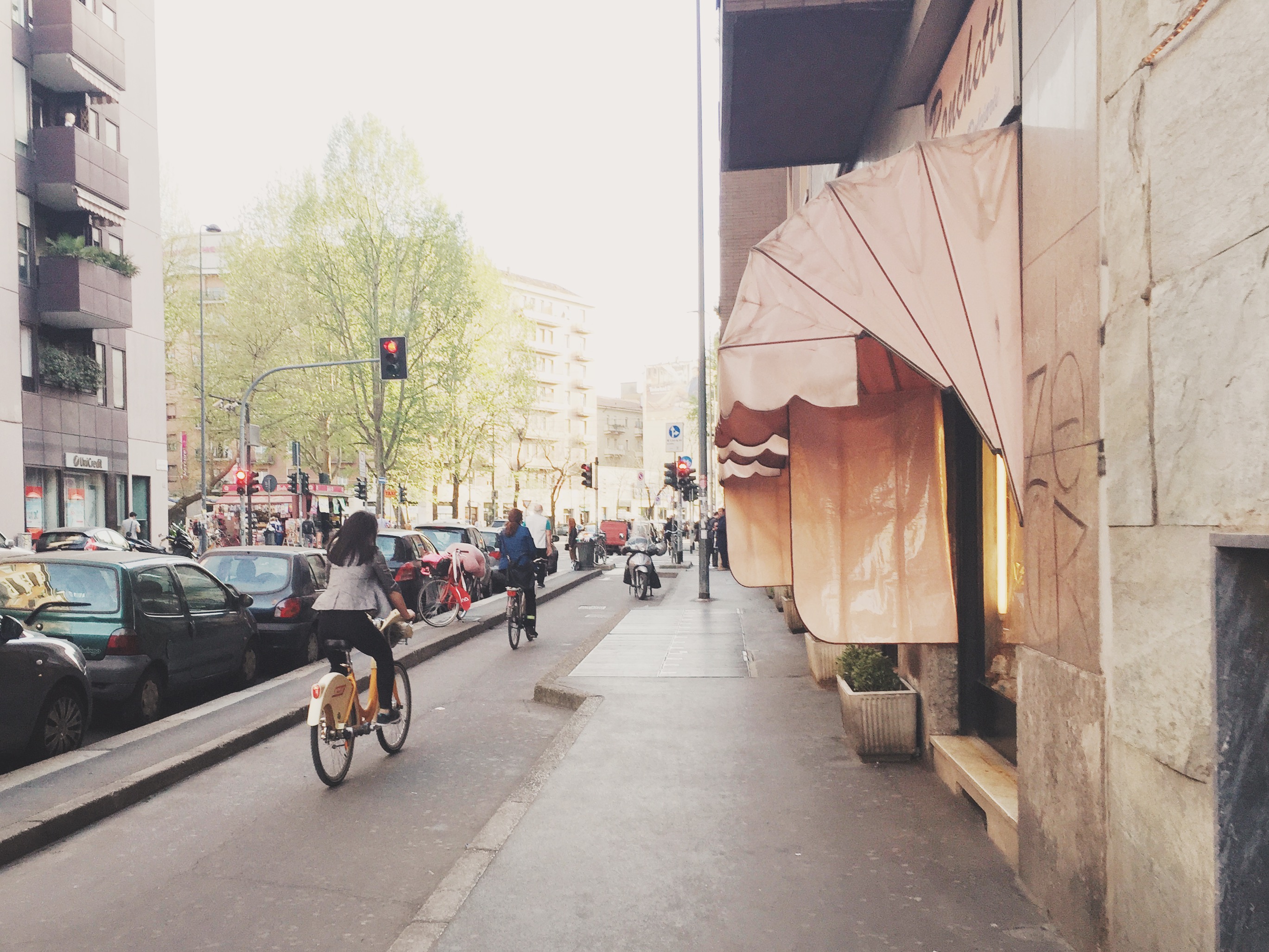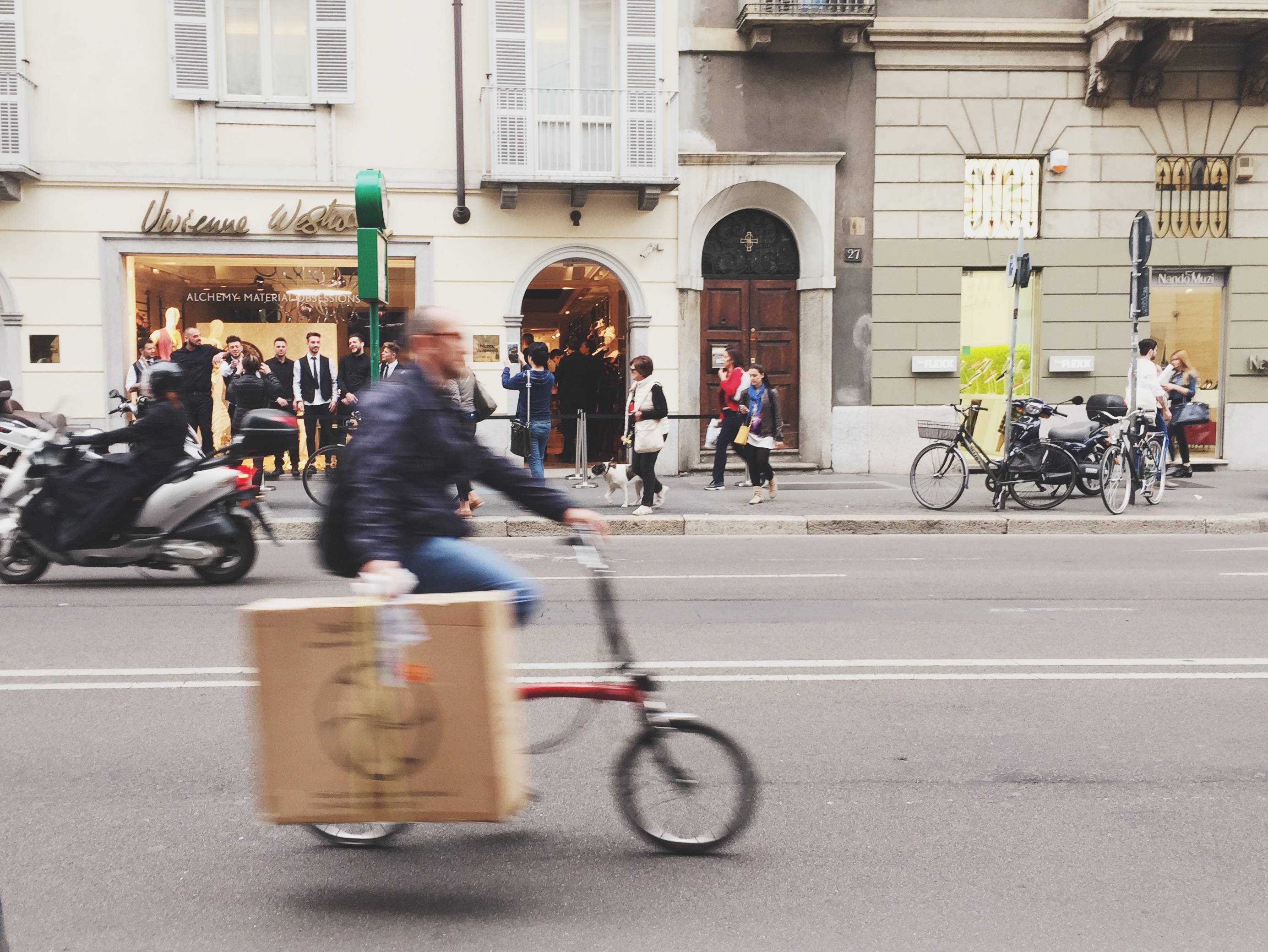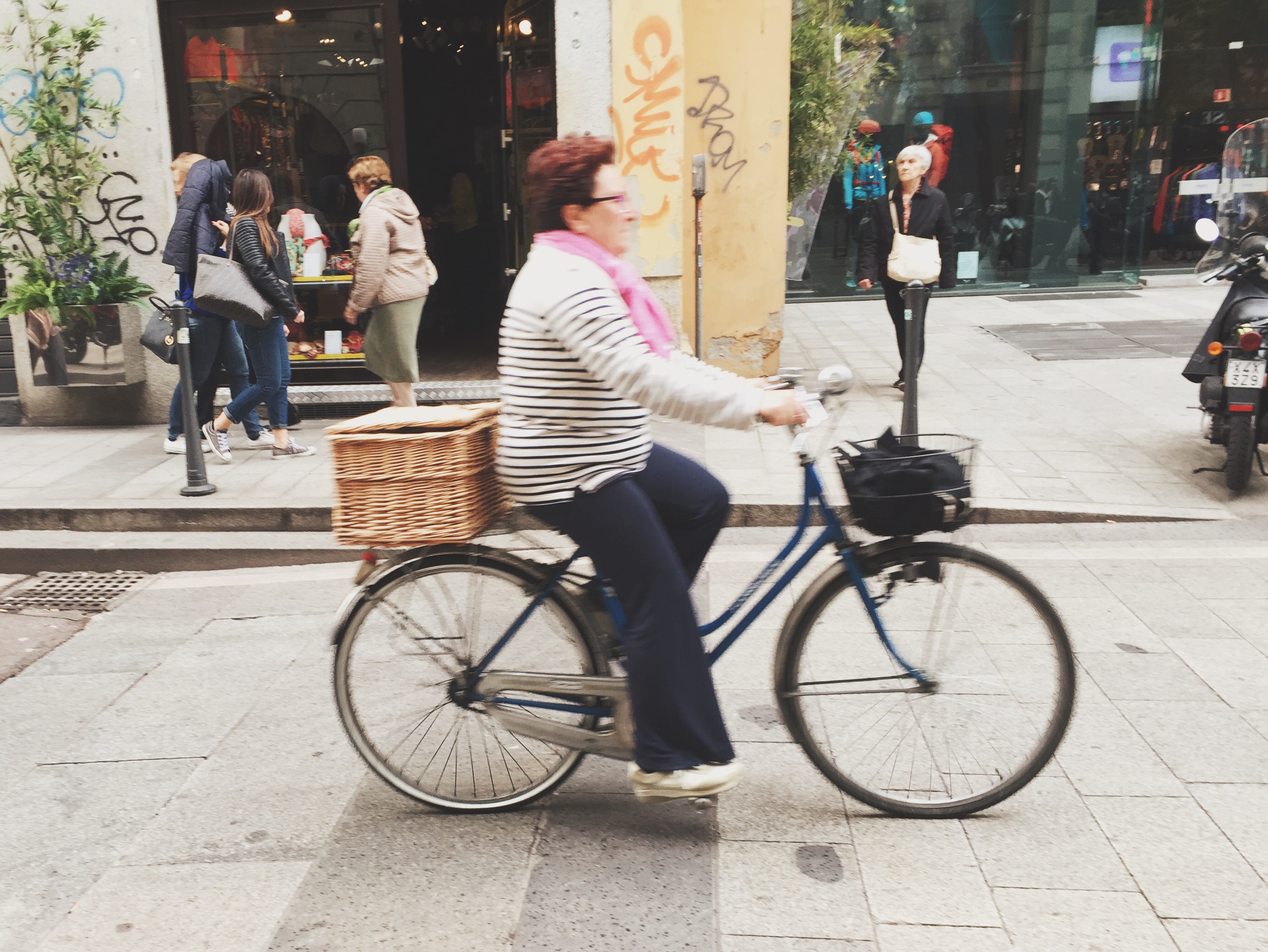 При существующих в Милане ограничениях скорости, местные велосипедисты могли бы вполне успешно соперничать с машинами, но вместо этого они в полной мере проявляют специфику национального характера. Итальянцы шумные, бойкие, но неспешные. Это дико бесит, когда ты стоишь в очереди на кассу, но радует, когда мимо тебя степенно едут на велосипеде симпатичные, хорошо одетые люди.