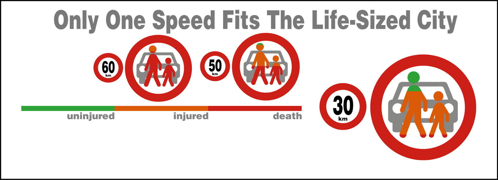 Вот схема, показывающая тяжесть травм при столкновении человека с машиной в зависимости от скорости. В городах, где заботятся о людям, а не о машинах, скорость на улицах всего 30 км/час. Скорость 50 км/час разрешается на автотрасах, вдали от жилых массивов.