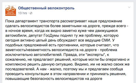 Возможно, такая альтернатива не по душе работникам госдумы и видным велоактивистам, которые садятся на велосипед три раза в год, чтобы попозировать для телевизора, а в остальное время мчат на машинах с ветерком. Но не надо верить этим людям: шлемы и светящиеся одежды — это не забота о велосипедистах, а такая же про-автомобильная мера как и бесчеловечные лимиты скорости. Любители быстрой езды будут и дальше морочить нам голову рассказами о том, что при снижении скорости «город встанет», и что-то там бубнить про «менталитет». Однако но никакого другого способа сделать наши города удобными и безопасными не существует.