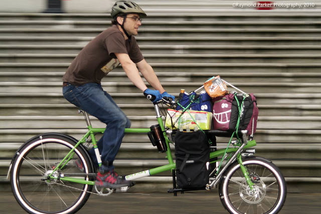 Высший пилотаж: хозяева спортивных велосипедов без корзинок утрамбовывают покупки в рюкзаки, а все, что туда не поместилось, везут в бумажных пакетах, гроздьями свисающих с руля.Tim Auger rides cargo
