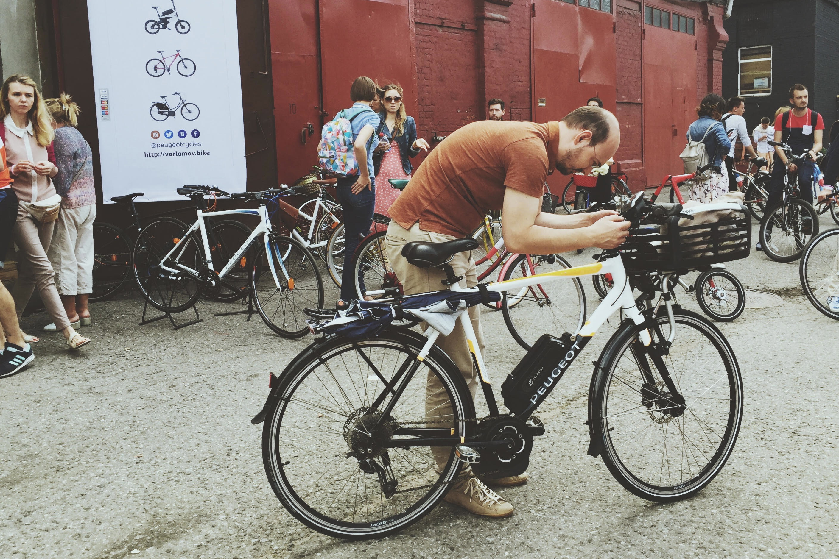 Сбор участников назначили на час дня, чтоб все успели проснуться. Люди выпивали, подкреплялись круассанами и орешками, болтали и готовили велосипеды. На фото — Михаил Богатырь налаживает электровелосипед для кого-то из участников.