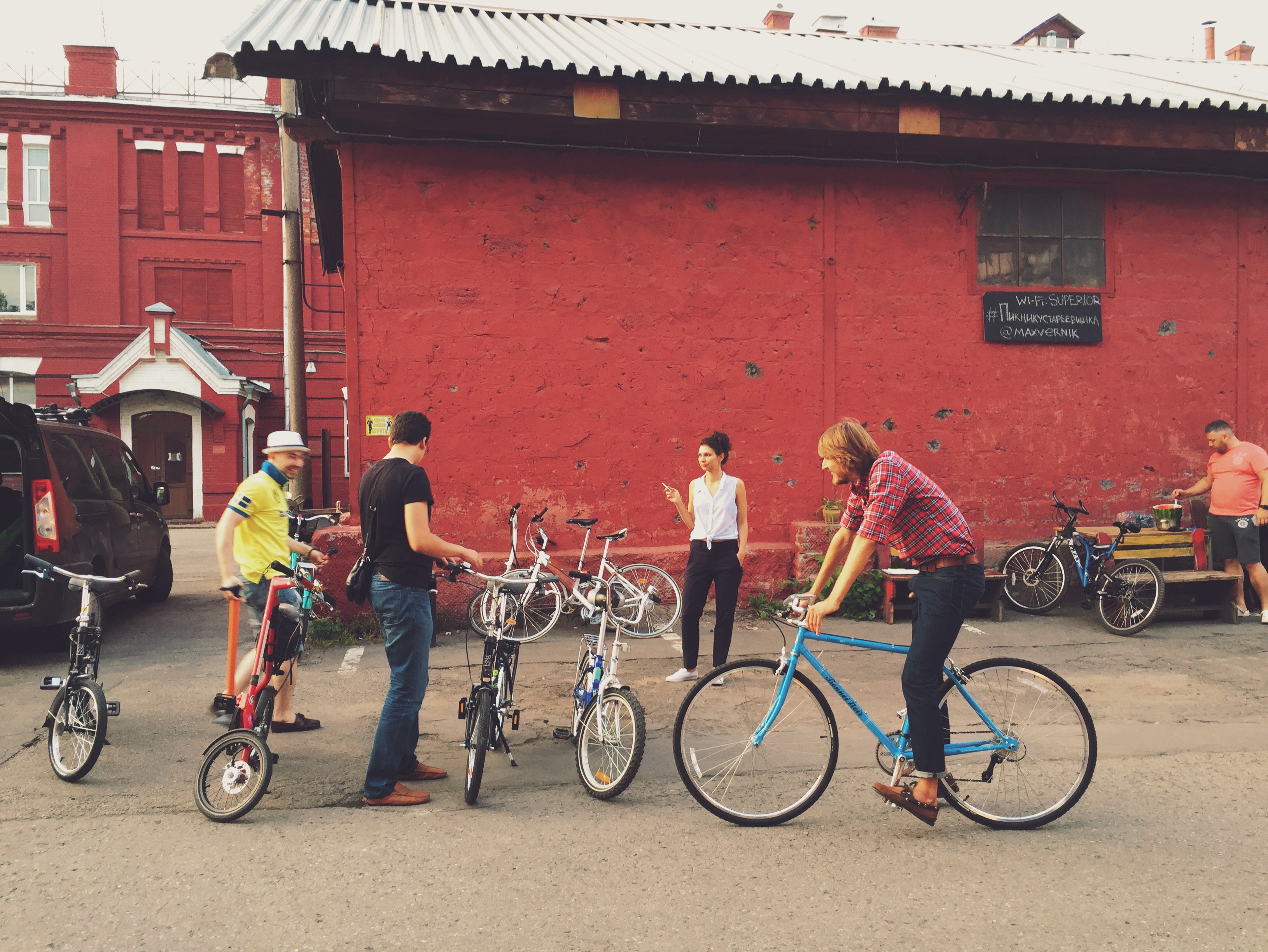 В прошлую пятницу Александр Колесников, совладелец магазина «Колесо-колесико, известного также как бисиклетная Peugeot, затеял устроить тест-драйв складных велосипедов разных марок. Связано это было с тем, что к ним в бисиклетную поступили складные велосипеды Gitane Mini Pop’a 2. Звучит все это очень серьезно, но на деле тест-драйв вылился в веселый вечерок в антураже красно-кирпичных стен завода «Кристал», на территории которого, по моим ощущением, все еще гуляет бодрящий ликеро-водочный дух.