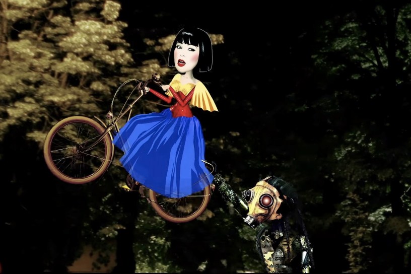 Артистка, напоминающая Мирей Матье в ее лучшие годы, в корсете, на круизере и в золотых туфлях спасается от стимпанковских монстров, зачем-то преображаясь с этой целью в Белоснежку из диснеевского мультфильма. Монстры тоже преображаются, но не в гномов, как можно было бы ожидать, а в заурядного вида парней, которые в итоге оказываются аккомпаниаторами вокалистки.