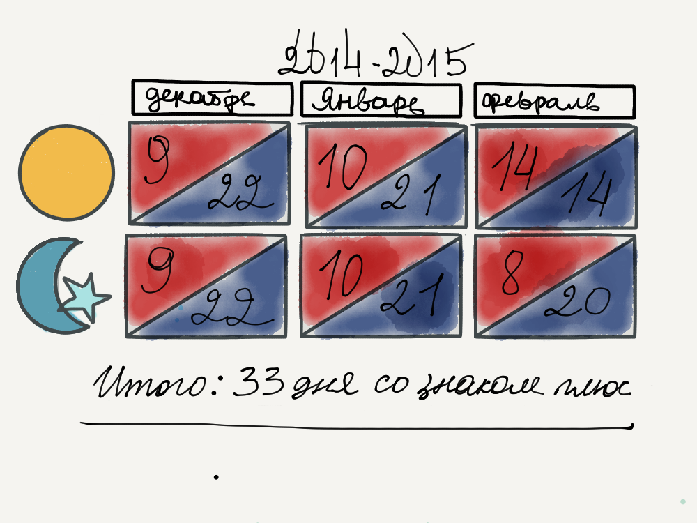 Кстати, чтобы она выглядела казалась чуть более лютой, дни, когда на градуснике ноль, пришлось засчитать за отрицательные (точно также посчитаны холодные дни в ноябре). Но все равно выходит как-то недостаточно по-зимнему.