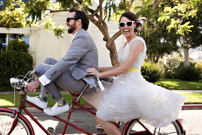Ребека и Дерек из Лос-Анджелеса поженились в 2011 году. В приглашении на свадьбу они просили гостей запастись удобной обувью, темными очками и солнцезащитным кремом. На выходе из церкви, где пара связала себя узами брака, их друзей ждали арендованные велосипеды, на которых они отправились в парк, чтобы отметить событие на свежем воздухе. Ну а сами молодожены оседлали красный тандем.