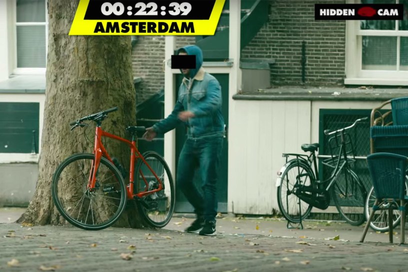 Угон велосипедов — проблема, с которой сталкиваются в самых разных странах. Даже там, где сам по себе уровень преступности не очень высокий. Обычно чем лучше в городе развит велотранспорт, тем больше там охотников до чужих велосипедов. Например, в Амстердаме добычей угонщиков становятся 40-50 тысяч велосипедов ежегодно. Многие боятся оставить велосипед вне поля зрения, даже если у них есть замок. В журнале We love Cycling решили выяснить, в каком из европейских городов живут самые проворные воришки и провели “Европейский чемпионат по угону велосипедов”. Для участия отобрали три города — Амстердам, Прагу и Рим. Организаторы оставляли на улице подсадные велосипеды без замка и включали счетчик. Как только угонщик сдвигал велосипед с места, раздавался хлопок, в воздух поднималось облачко цветного дыма, а из запаркованного по соседству грузовика летело конфетти и раздавалась победная музыка.