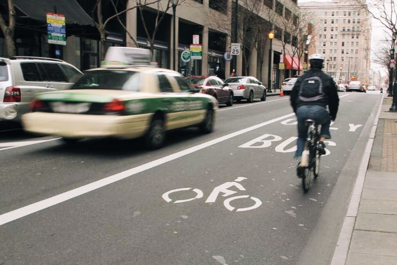 На фото вверху: выделенная полоса для общественного транспорта и велосипедов в Филадельфии. Фото: Emma Lee.