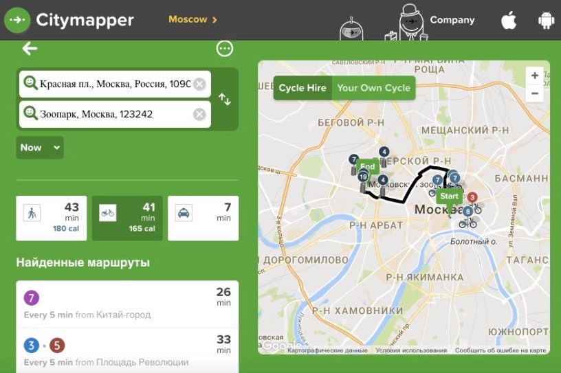 В Москве заработало транспортное приложение Citymapper, удобное, в том числе, и для тех людей, кто передвигается по городу на велосипеде.