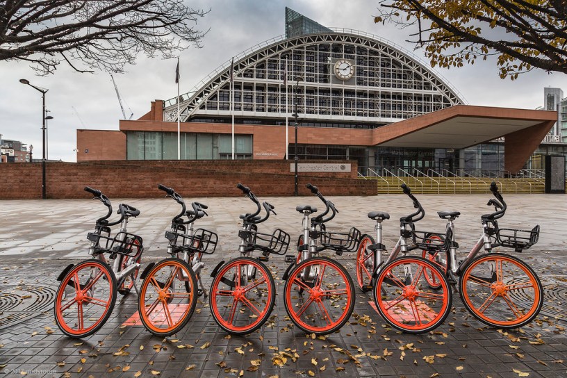 Вверху: велосипеды облачного велопроката Mobike в Манчестере, Andy Rouse.