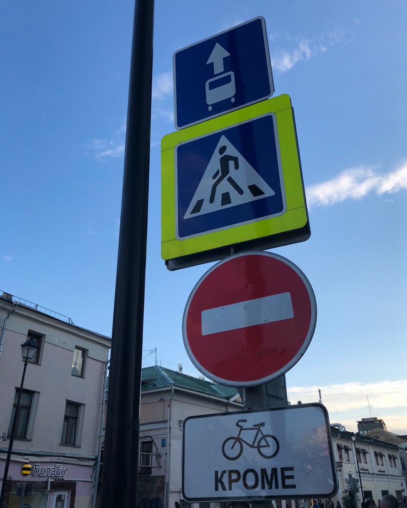 Но есть одна тонкость — в некоторых местах присутствие такси на выделенках нежелательно из-за большого потока маршрутного транспорта. И тогда там дополняют знак 5.14 знаком 3.1, известным в народе как кирпич. Он запрещает движение всем, кроме общественного транспорта. С Моховой — как раз такой случай. Строго говоря, велосипеды там ездить не могут — их запретили вместе с такси. Хотя скорее всего про них просто никто не подумал. По крайней мере в публикации на сайте ГИБДД, где рассматривают разные аспекты движения по выделенным полосам, про велосипеды даже не вспоминают.