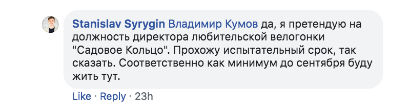 Есть предположение, что Сырыгин прибыл в Москву не только для организации разовой гонки, но и как человек, из которого дептранс будет выращивать нового лидера велодвижения. Это было бы логично: городская администрация в принципе против любых мероприятий и активистов — кроме своих собственных.