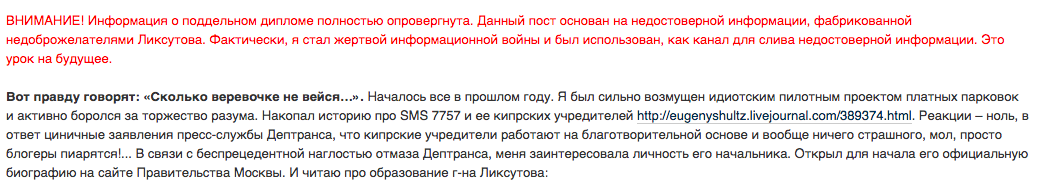 В 2013. Блогер Евгений Шульц пошёл войной на главу дептранса Максима Ликсутова. Вскоре после этого он получил работу в ЦОДД и вся критика сразу закончилась. Схема оказалась работающей. В 2018 году практически все активисты-урбанисты, которые раньше громко и звонко критиковали транспортную политику московской мэрии, так или иначе работают на дептранс или смежные с ним структуры.