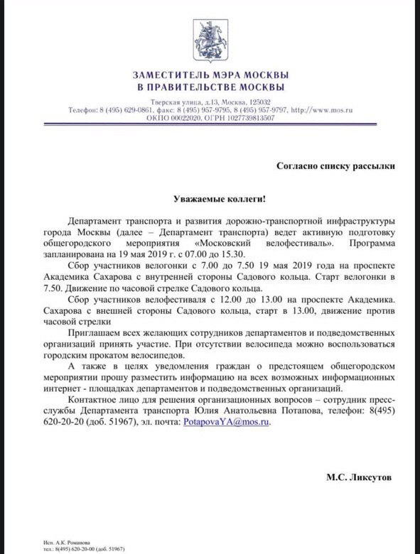 На прошлой неделе в соцсети утекли письма, которые рассылают руководители московских госструктур своим подчиненных. Тема этих писем — Московский велофестиваль. И если глава дептранса информирует коллег о предстоящем событии в нейтральной форме, то анонс велофестиваля среди пожарных выглядит тревожно.