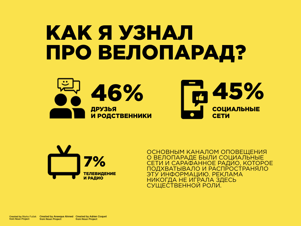 В случае с велопарадом реклама никогда не играла решающей роли — аудитория соцсетей практически полностью покрывала потребность в продвижении мероприятий. Люди узнавали о них в интернете, а потом информацию разносило сарафанное радио. Как следует из официального опроса, это обеспечивало больше 90% аудитории. У велофестиваля с его скромными соцсетями такой возможности нет, поэтому организаторы получат в этом году от города рекордный объем рекламной поддержки.