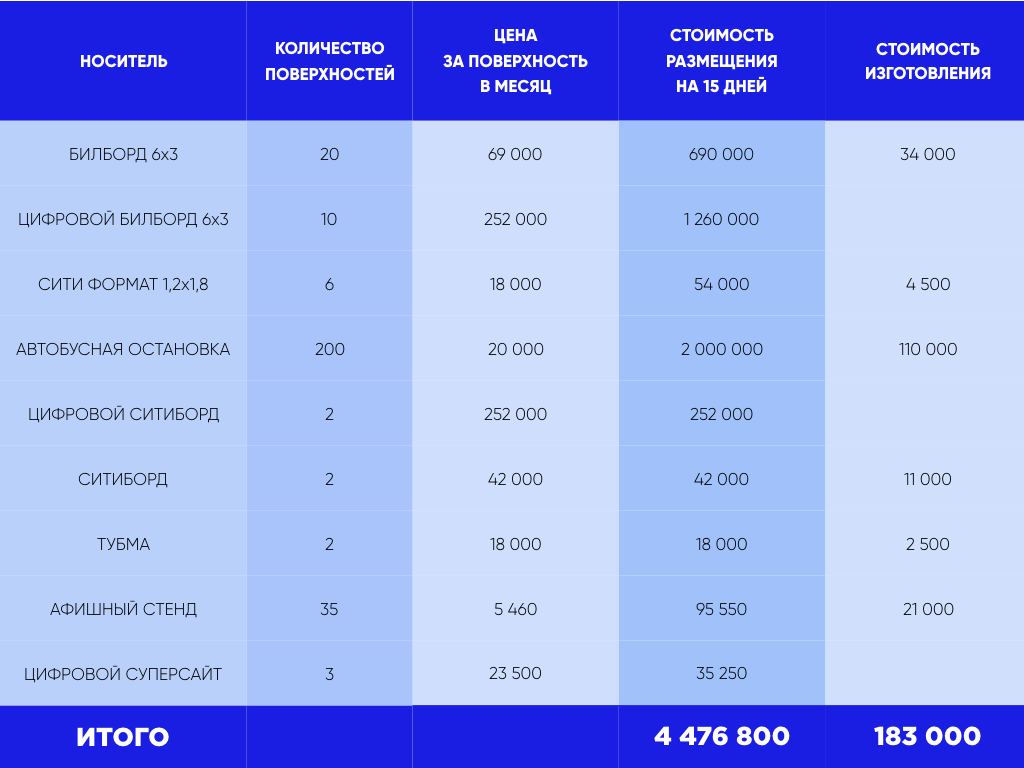 #velonaton решил посчитать, во что бы вылилось такое изобилие, если бы велофестиваль покупал рекламу по коммерческим расценкам. В таблице всего лишь часть позиций — там, где можно прикинуть расходы более-менее точно. Обычно агентства дают цены из расчета на месяц, но велофестиваль собирается рекламироваться всего две недели, поэтому стоимость была уполовинена. Расходы не изготовление материалов брались по самому низкому тарифу — невысокое качество печати и не на самоклеющейся плёнке, а на обычной бумаге.