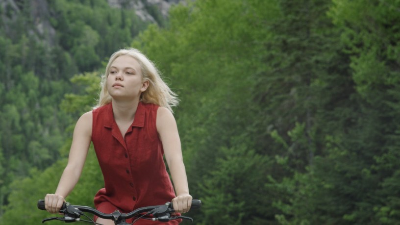 Девушка в красном комбинезоне сообщает, что готова целую вечность ехать на велосипеде по автотрассе с отбойниками. Хорошо, что это всего лишь монтаж.