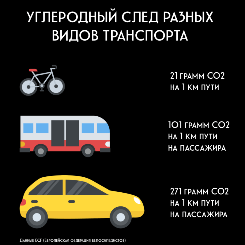 Значит ли это, что велосипед вообще безвреден для природы? Не совсем. В Европейской федерации велосипедистов считают, что оценивая экологичность транспорта, надо учитывать, как его производят и на каком топливе он ездит, даже если это топливо — ваш завтрак. Но и с учётом этих пунктов велосипед всё равно намного “зеленее”.