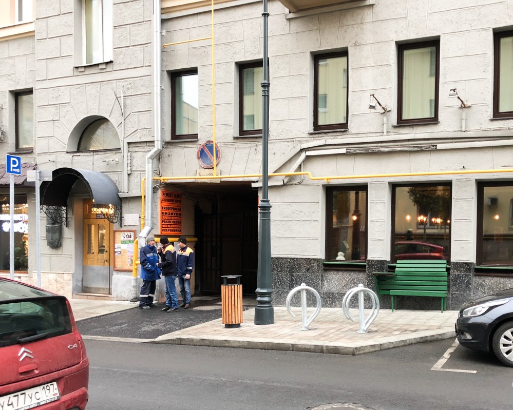При этом на соседних улицах с куда более активным трафиком — Тверской и Садовом кольце, оставить велосипед вообще негде, ни тебе парковок, ни даже столбов с заборами.
