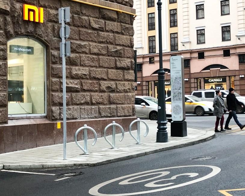 При этом на соседних улицах с куда более активным трафиком — Тверской и Садовом кольце, оставить велосипед вообще негде, ни тебе парковок, ни даже столбов с заборами.