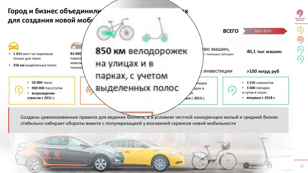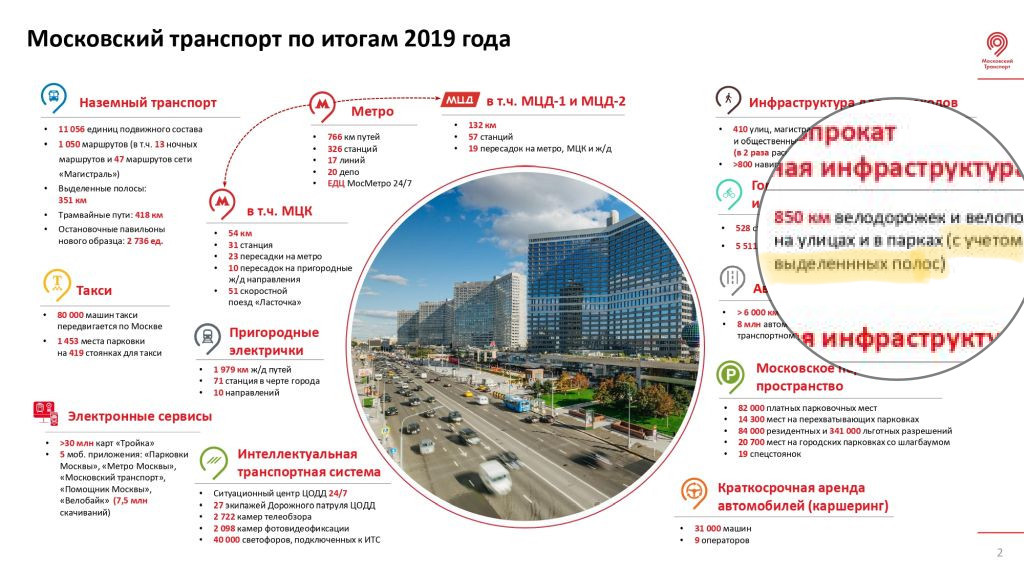 На сайте «Дирекции московского транспортного узла» появилась презентация о транспортных достижениях за 2019 год. Среди рекордов упоминаются 850 км велодорожек. Что можно сказать: мэрия Москвы продолжает создавать миф о своей безграничной заботе о велотранспорте, ну а мы продолжаем его разоблачать.