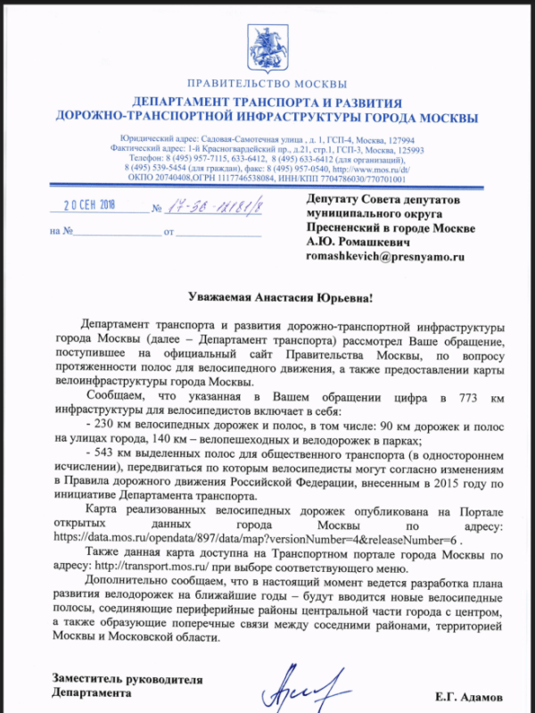 В 2018 году в разгар переписки об этих мифических 773 км мне позвонил советник главы дептранса Алексей Митяев, который пытался доказывать, что автобусные выделенки ничем не хуже велодорожек. «Рекомендует ли дептранс ездить по автобусным выделенкам детям?» — спросила я его. «Почему обязательно детям?» — ответил мне на это Алексей.