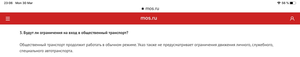 За понедельник на сайте мэрии появилось два материала с разъяснениями по поводу режима изоляции. Утром был опубликован текст под названием «Как покупать рецептурные лекарства, можно ли уехать на дачу и позаниматься спортом: ответы на вопросы о режиме самоизоляции». В нем сообщается, что для транспорта, включая личный, никаких ограничений нет. Даже для мотоциклов. Про велосипеды ни слова, но согласно ПДД они тоже транспорт, поэтому ограничений быть не должно. По данным Thе Village, запрета на велосипеды нет.
