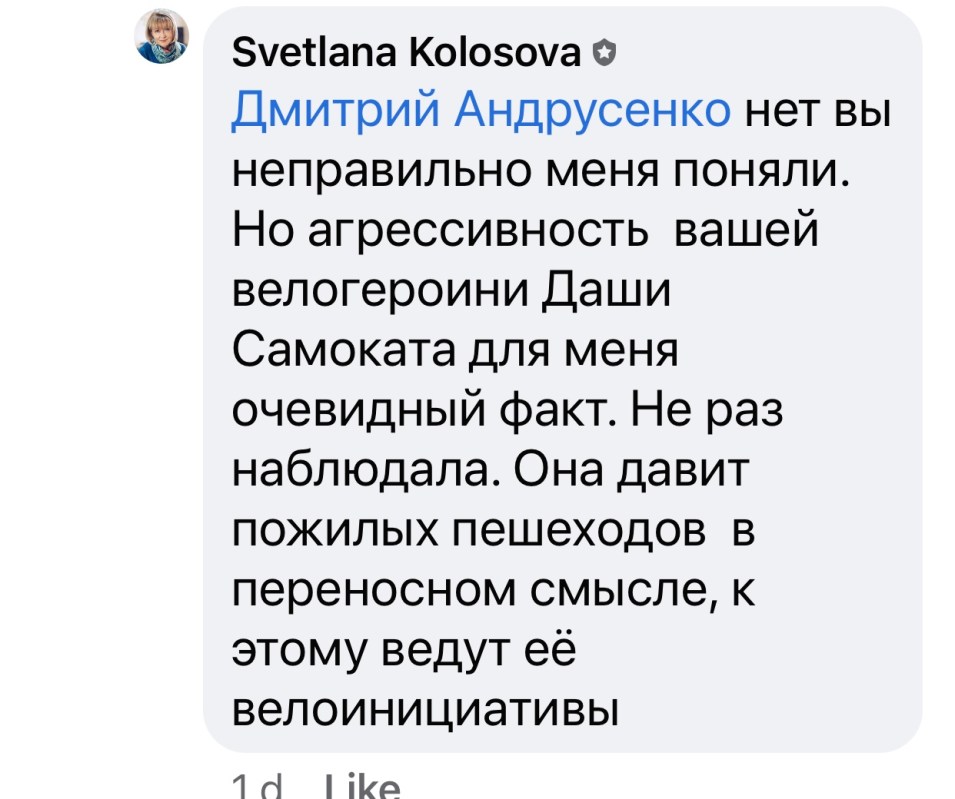 Сейчас под исходным постом больше 400 комментариев, я цитирую самые замечательные. Довольно быстро неприятный, но частный случай принял масштабы общегородской проблемы. Выяснилось, что велосипедисты страшно опасны и то и дело уничтожают старушек на пешеходных переходах.