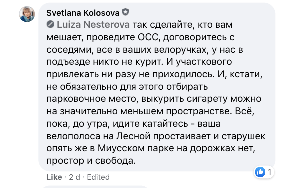 Читая таки дискуссии, легко поверить, что москвичи поголовно против велосипедов. И когда чиновники дептранса осторожничают в вопросе создания велоинфрастуктуры, это выглядит логично — они опасаются гнева большинства. Но так ли это? В Тверском районе живут 79 тысяч человек. В соседской группе состоят около 11 тысяч, но в обсуждении велосипедистов активно участвовали человек тридцать максимум. Но важно даже не это — люди, чья мнение не совпадает с точкой зрения администратора группы Светланы Колосовой, просто не высовываются. Депутат Тверского района Галина Фильченко в группе заблокирована. Местная жительница Луиза Нестерова, которая пытается защищать велосипедистов, подвергается ехидным наездам.