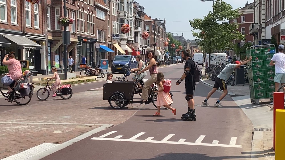 Проезжая часть занимала много места, при этом велосипеды уже с трудом помещались на своей дорожке, а тротуары были узенькие. Несколько лет назад администрация города решила все переделать, устроила общественные обсуждения с местными жителями, бизнесом и велосипедными организациями, и все сошлись не том, что Нахтгальстраат должна стать так называемой велосипедной улицей. То есть улицей с приоритетом велосипедистов, смешанными движением и ограничением скорости в 30 км/ч (раньше здесь можно было разгоняться до 50 км/ч).