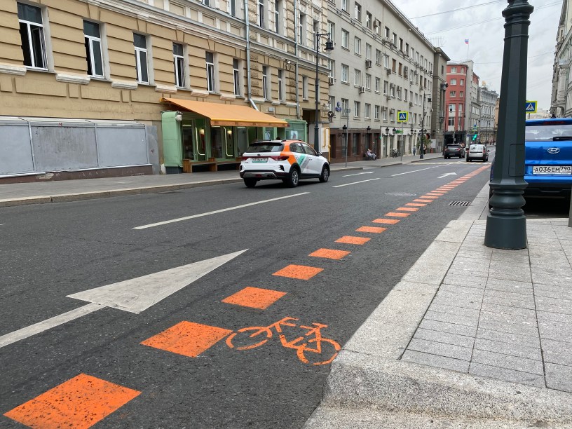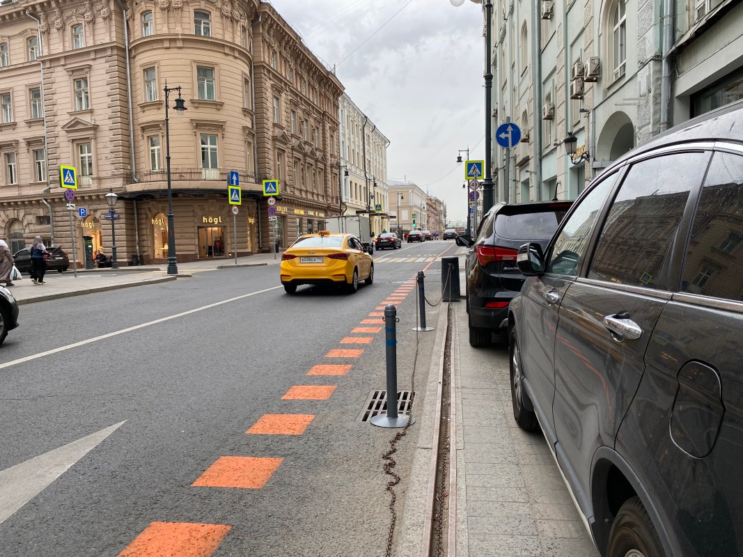Улица Петровка довольно длинная, и сейчас речь пойдет только о той её части, которая находится внутри бульварного кольца. Дорожка, которая здесь появилась на днях, ничем не отличается от другой временной инфраструктуры — она нарисована оранжевой краской, идет перед парковкой и прерывается на перекрестках. А еще она узкая. Это важно, потому что сегодня мы будем говорить только о ширине.
