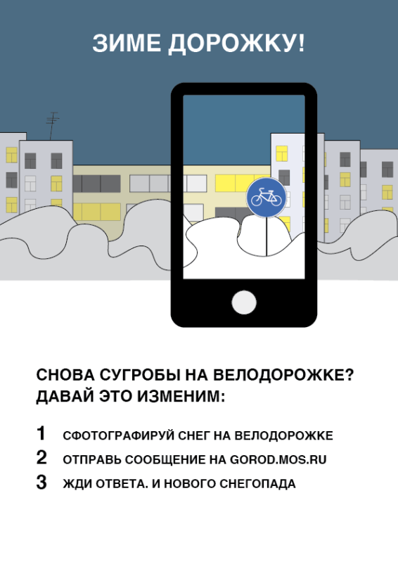 Все очень просто: вы фотографируете заваленную снегом велодорожку, заходите на сайт или в приложение, и отправляете фото с коротким комментарием. Дальше городские службы должны за 8 дней убрать беспорядок и отправить вам отчет. А еще можно скачать инструкцию и распространять ее среди друзей и товарищей, чтобы они тоже подключились к фиксированию неубранной инфраструктуры.