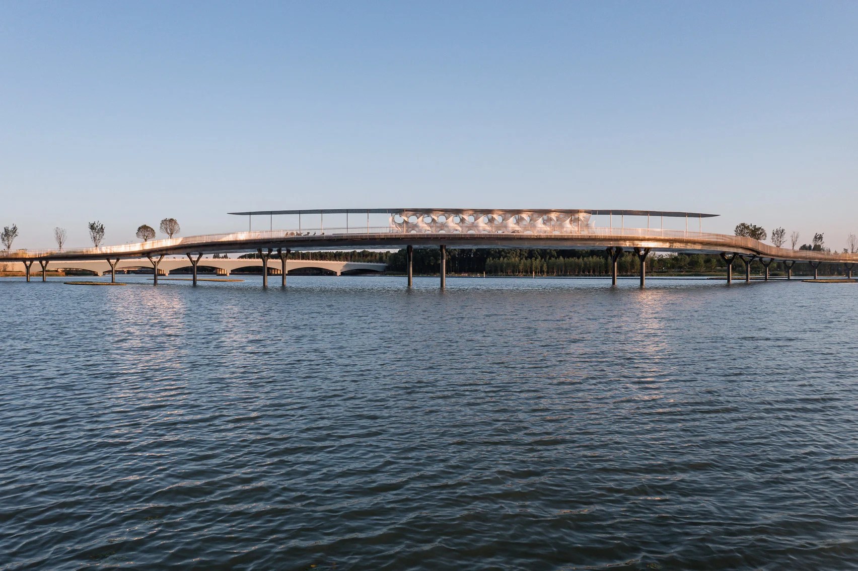 Мост через озеро Юаньдан соединяет окрестности Шанхая и провинцию Цзянсу. Конструкцию длиной 586 метров спроектировало китайско-австралийское архитектурное бюро Brearley Architects + Urbanists (BAU). На первый взгляд, петляющий над водой полукилометровый мост — не самая практичная идея, напрямую было бы короче.