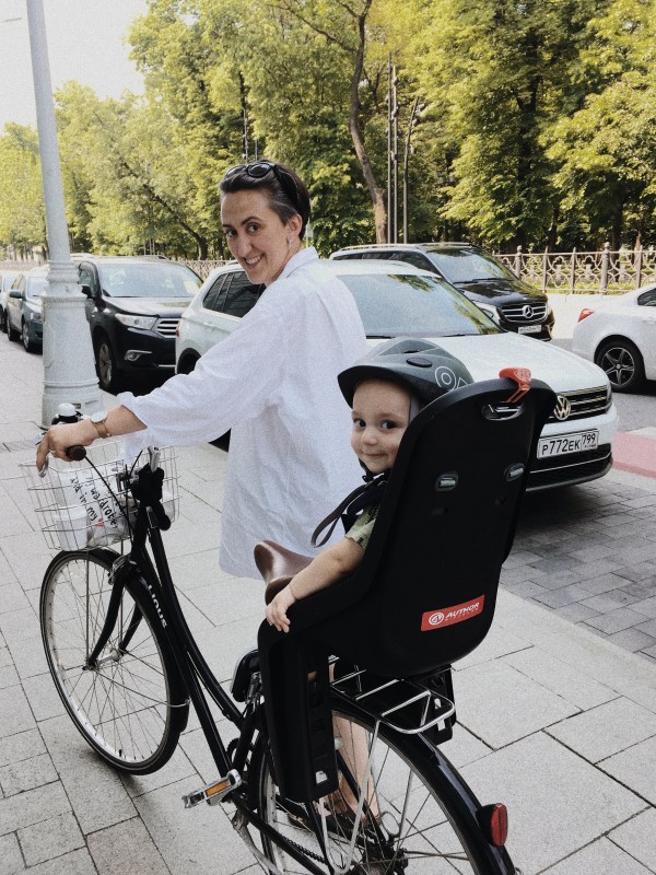 Катя При выборе первого велокресла я поняла: хочу, чтобы ребенок впереди меня — он был маленький, и я хотела видеть и знать, что он делает и все ли хорошо. Поэтому купила кресло Bobike Mini. Мы откатали в нем с февраля по июнь, и ребенок пересел в заднее (ноунейм, подруга отдала). В мечтах — каргобайк. Я недолго жила в Дании, да и ребенок мой датская полукровка, и я хотела бы возить детей так, как в Копенгагене. Но для этого Москва должна стать более плоской (что невозможно) и должна появится инфраструктура, которой почти нет.