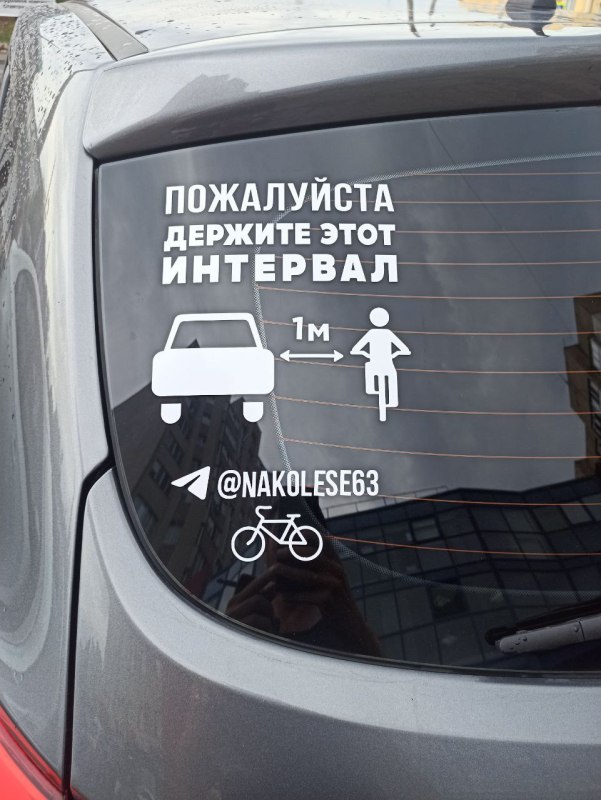 При этом автоводителям ничто не мешает соблюдать это правило по доброй воле. Разумные люди так и делают. Активист Александр из Самары именно на этих людей и уповает. Он придумал наклейки с призывом держать дистанцию в 1 метр от велосипедистов, распечатал несколько штук, наклеил на свой автомбиль и предложил товарищам. Так машины стали носителями самодельной социальной рекламы. Это отличная идея!