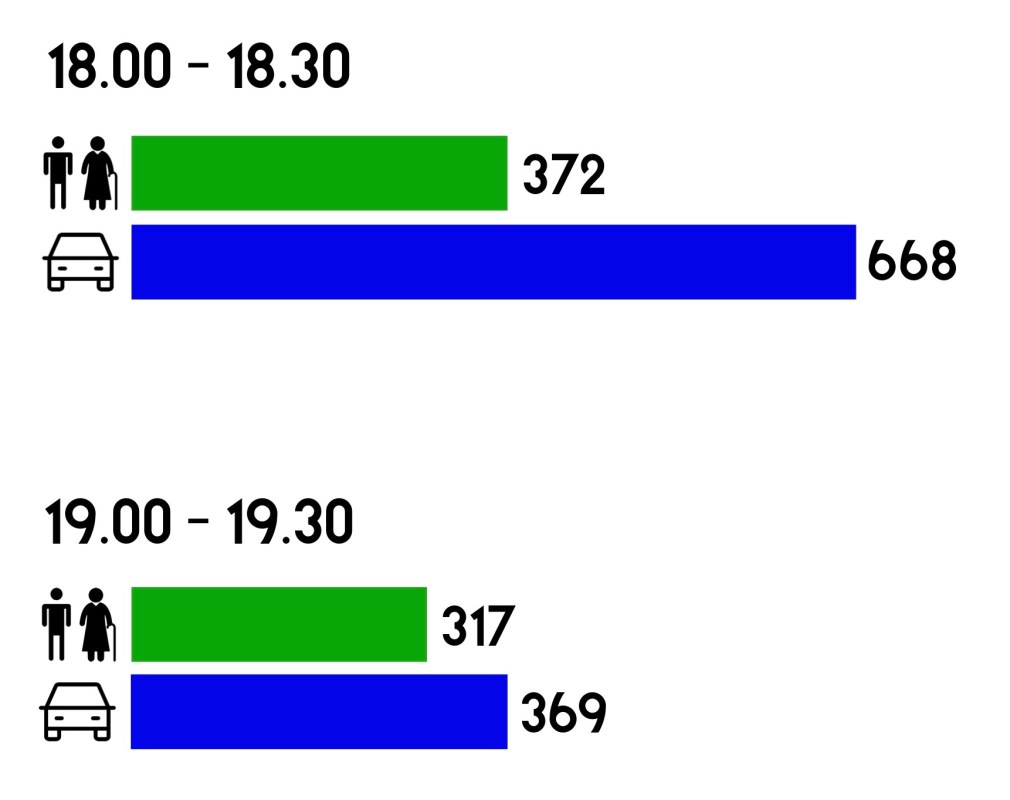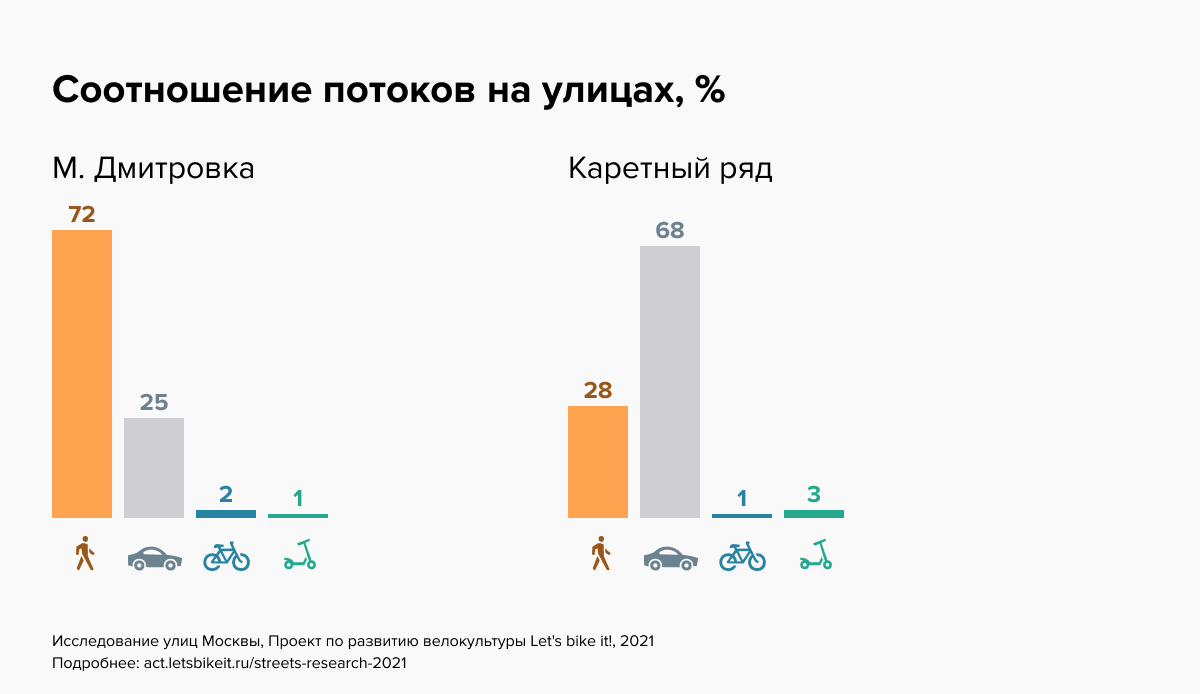 Есть такое мнение, что машин в городе вообще всегда больше, чем пешеходов. Это не так — достаточно свериться с данным аналогичного исследования Let’s bike it!, которое делалось в 2021 году на улицах внутри ТТК.