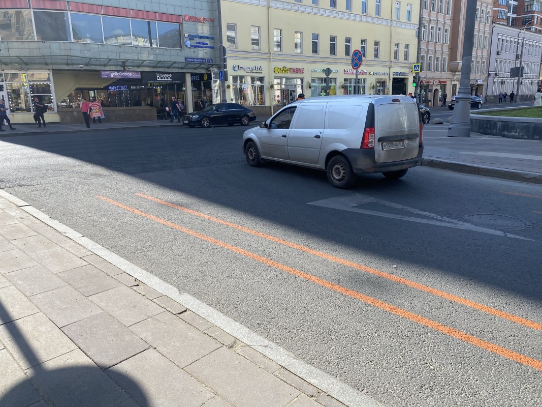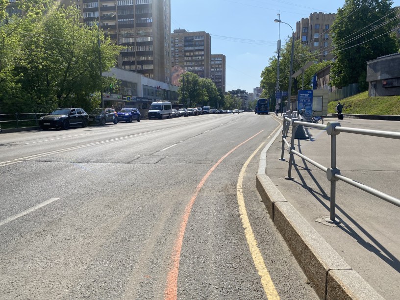 Но и это еще не венец профнепригодности. Если присмотреться, то слева от полосы, виднеются пятна от стертой разметки. Потому что как бы ни была плоха эта велополоса, но это уже исправленный вариант. Сперва ее нарисовали еще дальше от правого края проезжей части! И нет, я не верю в ошибку дорожников — просто в дептрансе работают люди, которые вообще не понимают, что такое велоинфраструктура и как ей пользуются настоящие живые люди.
