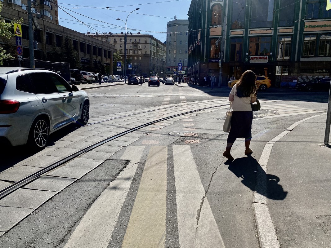 Едем дальше, но тут вдруг велополоса прерывается. Между Новосущёвской и Сущёвской никакой велоинфраструктуры нет. Она возрождается из пепла на перекрестке с трамвайными путями. И если до сих пор это была просто глупость, то здесь уже натуральное вредительство с риском для вашей жизни. Потому что пересекать трамвайные пути на велосипеде надо под прямым углом, чтобы колесо не пошло юзом в рельсах, но проектировщики дептранса об этом не знают и направляют велосипеды по траектории, которая чревата аварией. Так что у вас есть замечательный выбор: либо вы едете по велополосе с риском падения, либо пренебрегаете ПДД, выбирая более безопасный вариант переезда. Ох уже эти велосипедисты, вечно они нарушают правила!