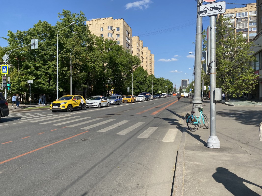 Дальше велополоса снова пропадает, прерываясь на автомобильную парковку — чтобы вы не забывали о приоритетах дептранса, — а дальше ещё метров пятьдесят и вот она, Новослободская. Пора в обратный путь.