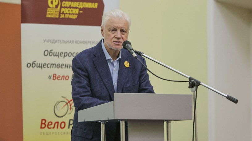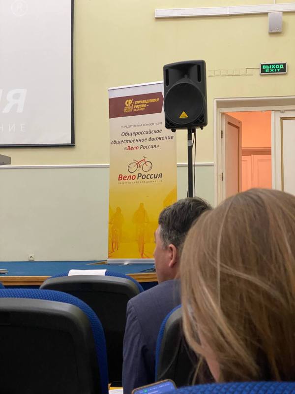 У “ВелоРосии” есть она большая проблема, и во время конференции она всё время была на сцене — это стойки мероприятия с логотипом партии “Справедливая Россия — Патриоты — За правду” (попросту говоря, СР). Глава партии Сергей Миронов открыл конференцию и стал главой попечительского совета новой НКО, а участники получили папки, в которые был вложены фирменные блокноты и ручки партии.