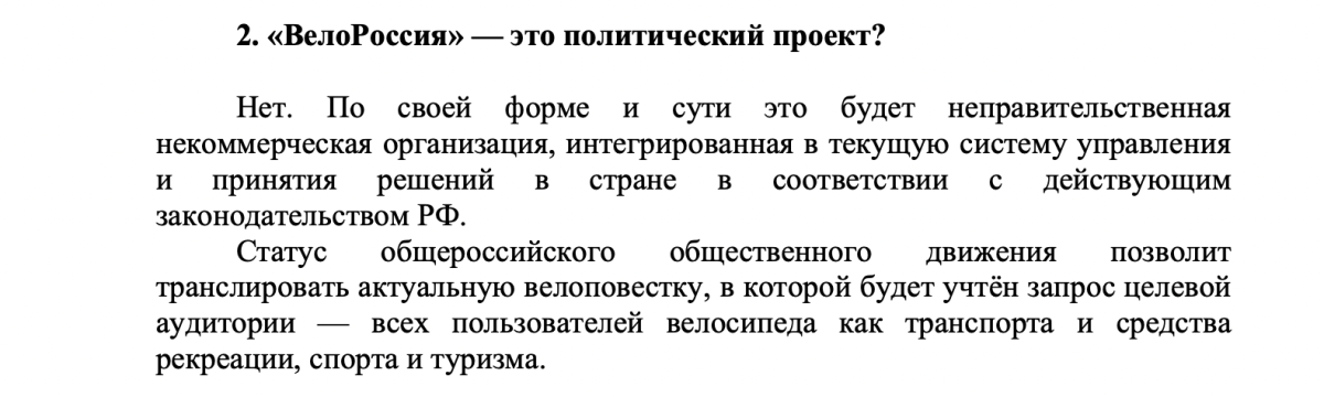 Сотрудничать с разными политическими силами — нормальная практика для общественных НКО. Но брендирование мероприятия логотипом одной из партий — это не сотрудничество, а признак покровительства. Мы живем в стране, где “все всё понимают” и знают, что независимое общественное движение, не имеющее авторизованных патронов, имеет мало шансов. Чтобы делать свой проект, надо дружить с “нужными людьми”. А большинство активистов, из которых во многом складывается “ВелоРоссия”, — это люди, которые живут и дышат своими проектами.